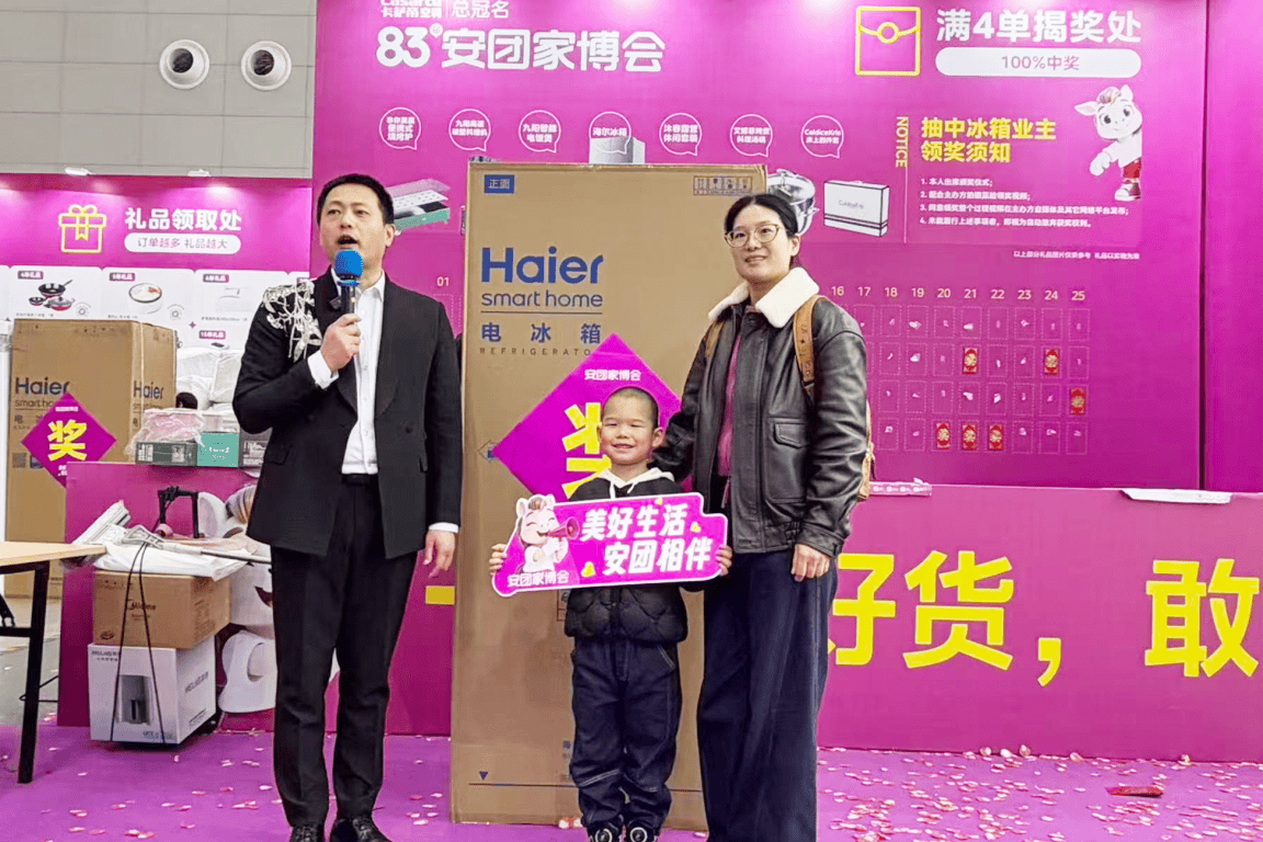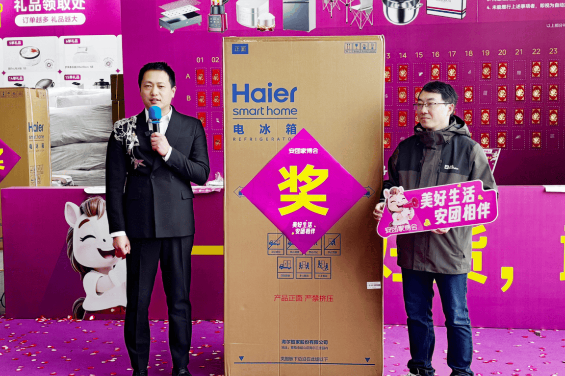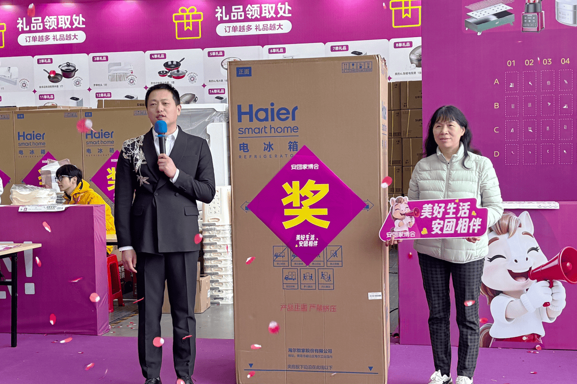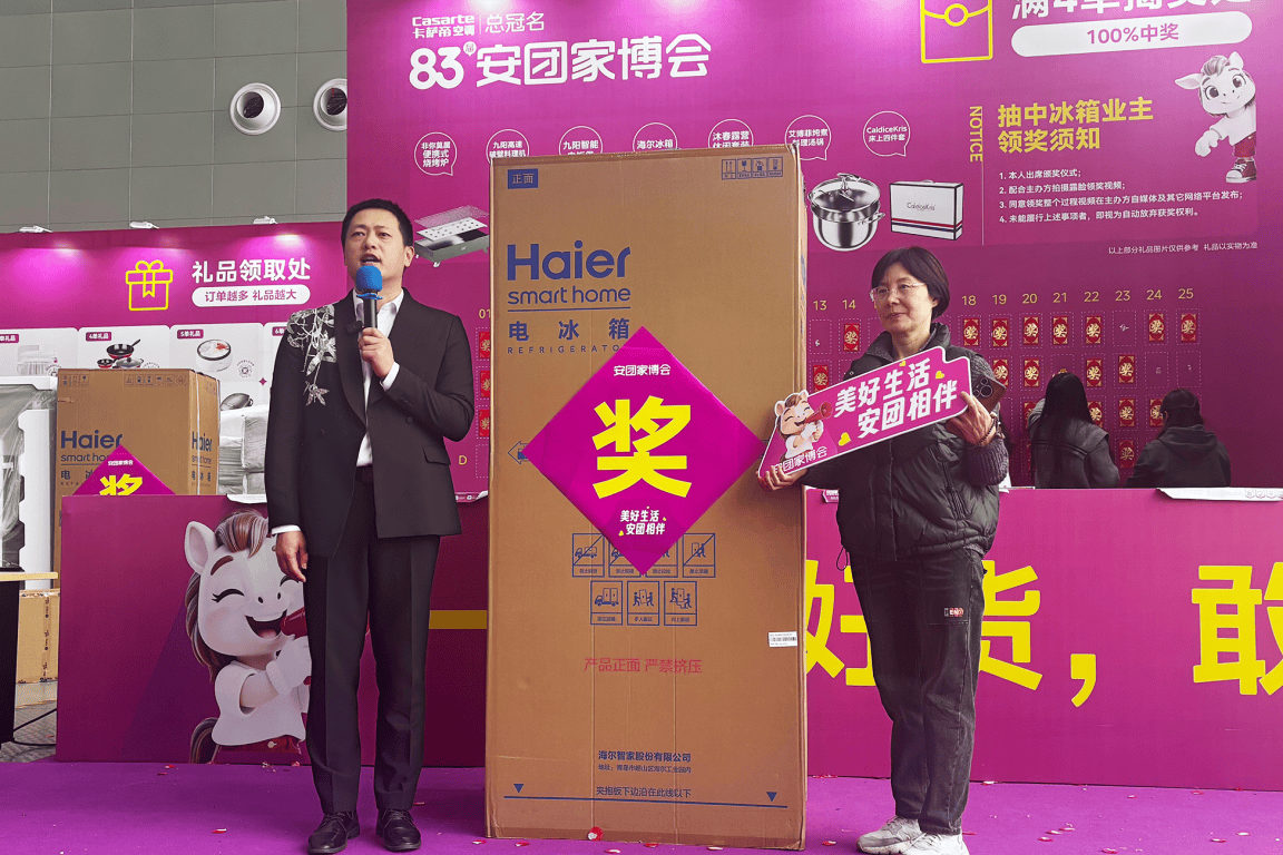 展会期间,备受瞩目的莫过于抽冰箱福利活动,海尔冰箱大奖的接连送出,成为现场最具热度的亮点,一次次将活动气氛推向高潮。3月20日,活动启幕不久,来自高建尚辰苑甄先生徐女士便率先喜提海尔冰箱大奖,这份突如其来的惊喜,不仅是对幸运者的祝福,更彰显了安团家博会对每一位到场业主的重视与诚意。